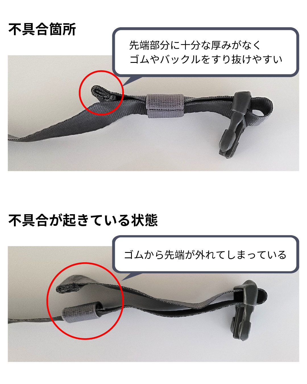 ベルト部分の先端厚みが薄いため、ゴム及びバックルから先端が抜ける可能性があることが確認されました。