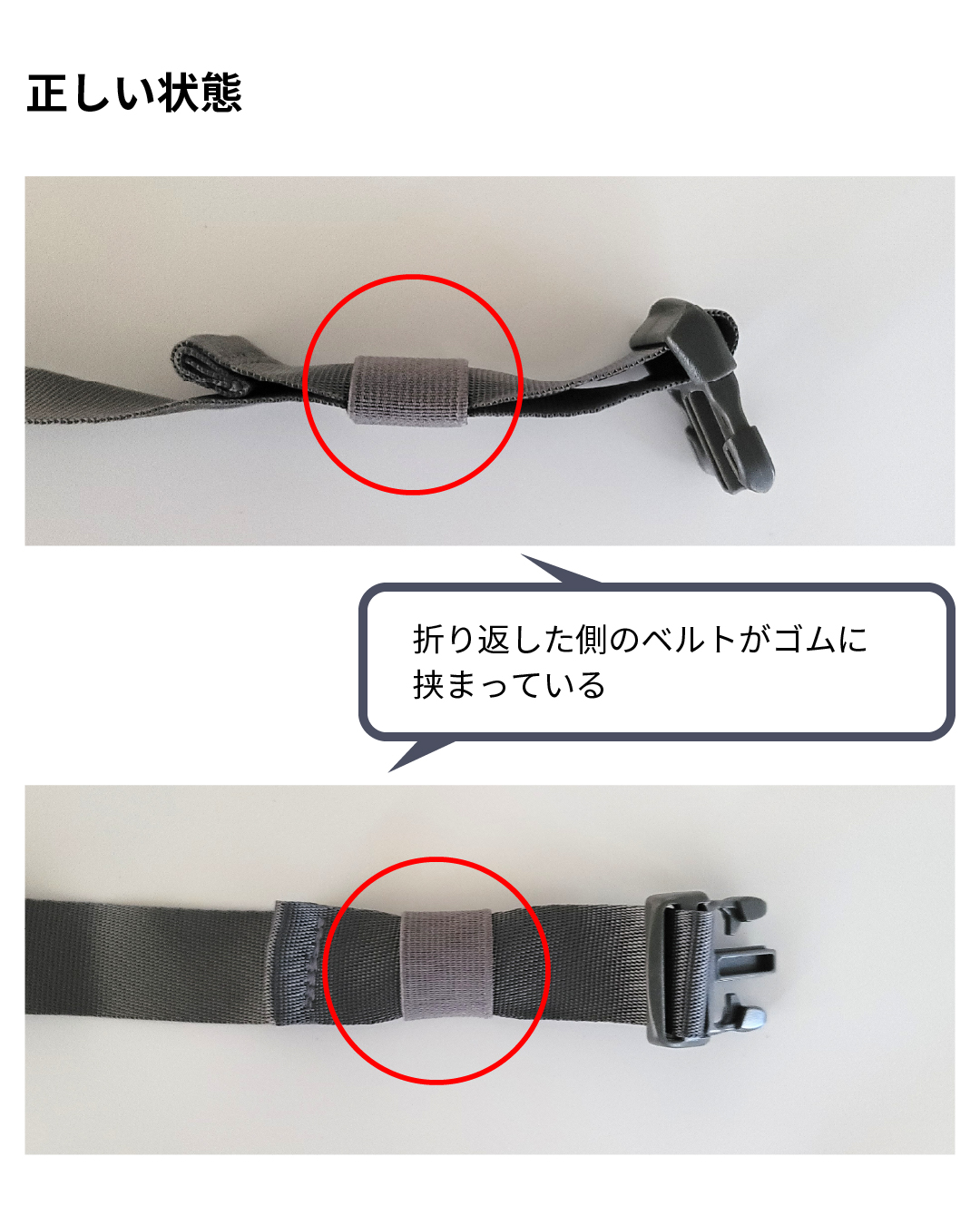 背当てとしてご使用していない際に、ベルトがゴム部分をすり抜けバックルより外れるおそれがあります。